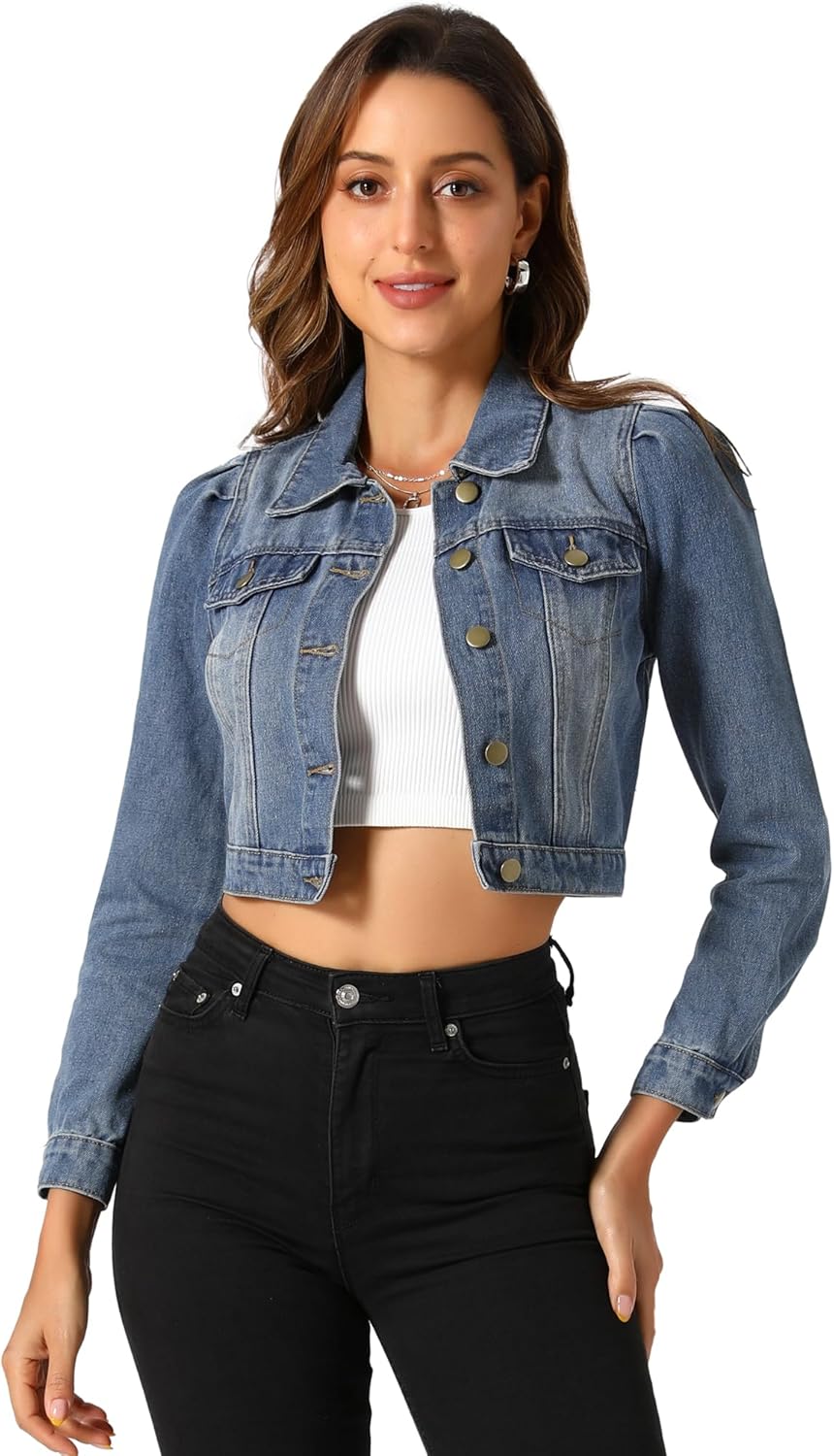 Allegra K Women's Denim Jackets Jean Puff Sleeve Button Up Cropped Jacket