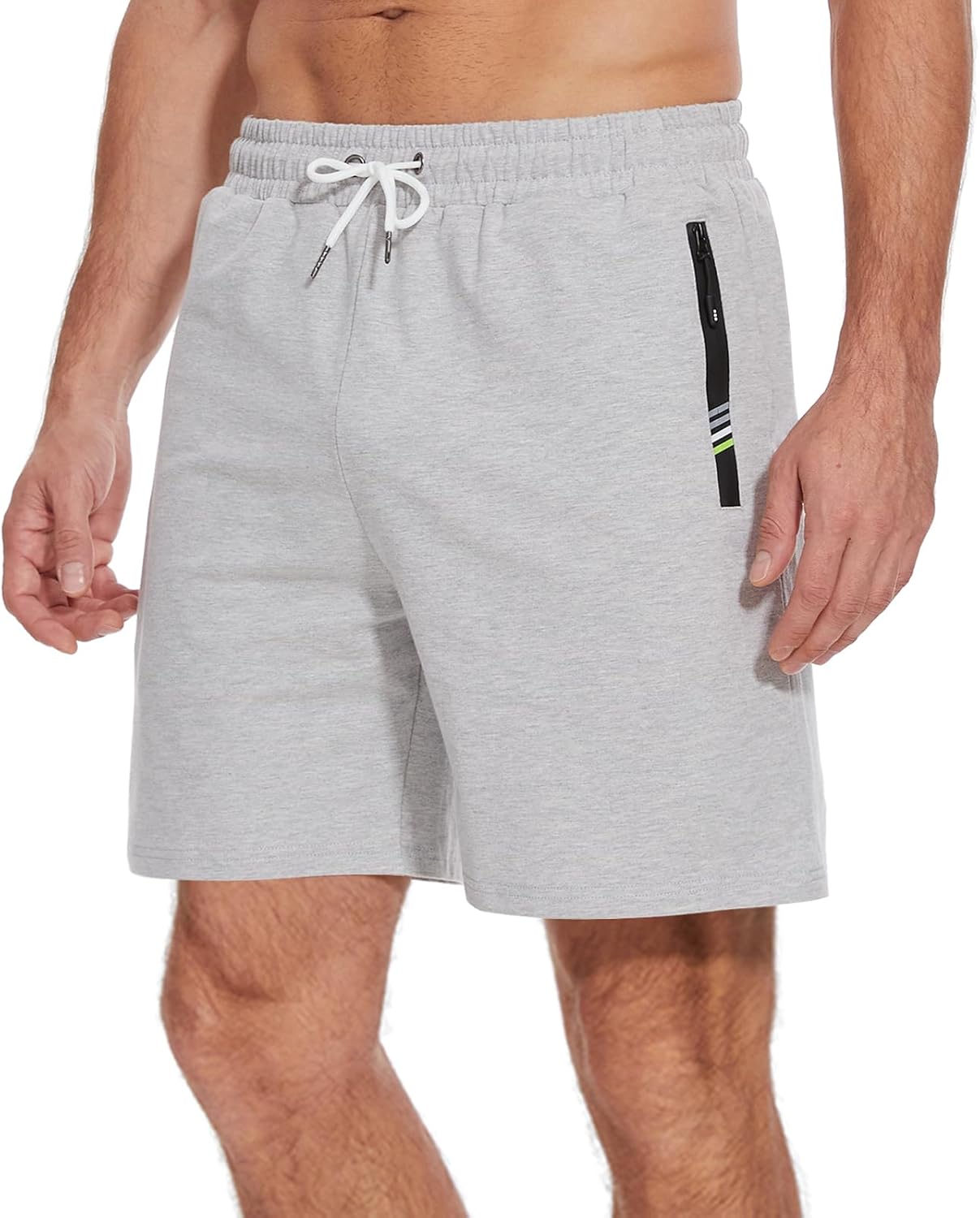 HEALONG Mens Athletic Shorts Cotton: Workout Gym Running Exercise Training - 7" Drawstring Fashion Sports with Zipper Pockets