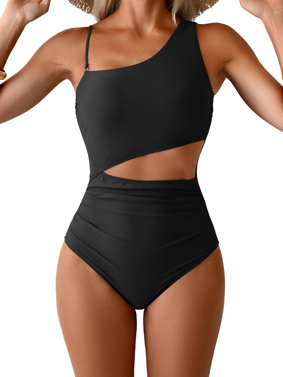 Women's Sexy One Piece Swimsuit One Shoulder Bathing Suit with Removable Strap Cutout Tummy Control Ruched Swimwear