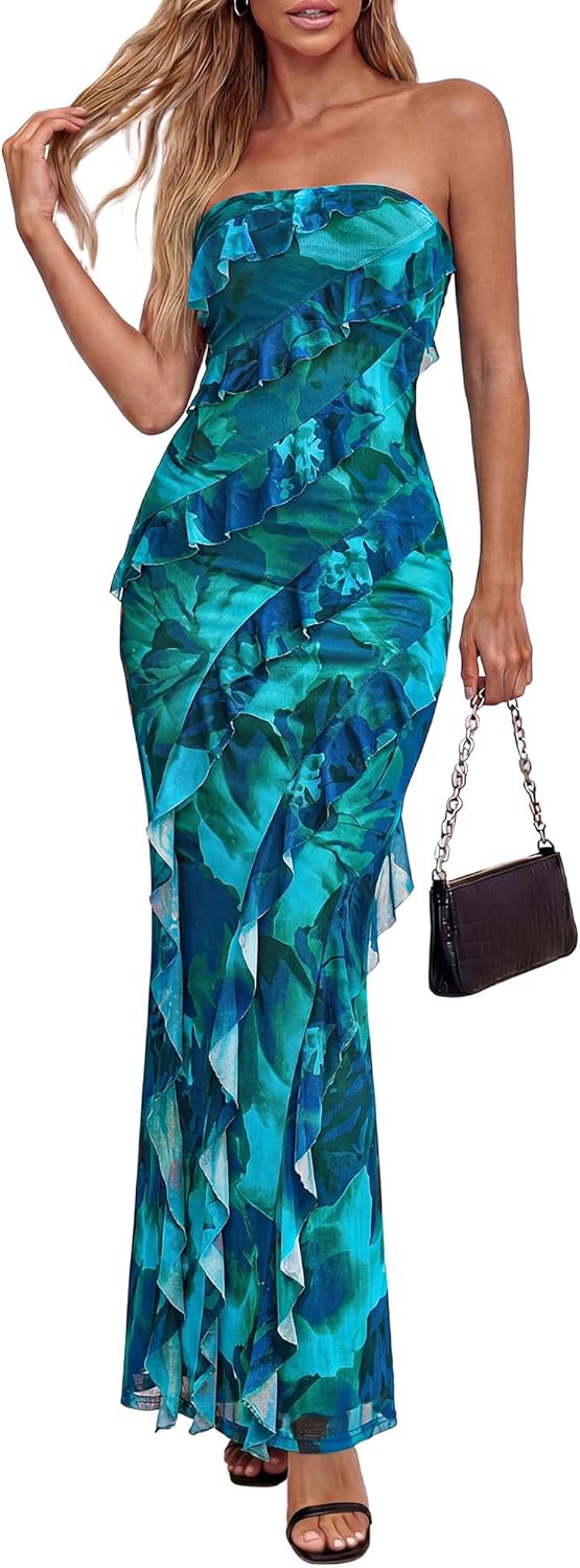 BTFBM Spring Dresses for Women 2026 Strapless Maxi Ruched Bodycon Floral Ruffle Cocktail Formal Wedding Guest Dress