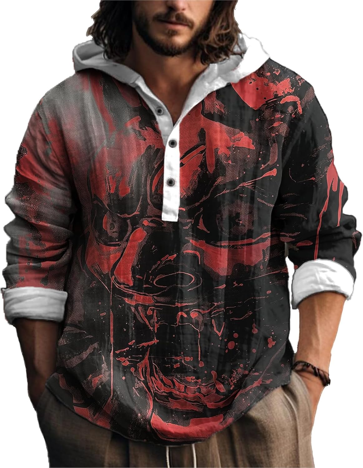 MARSVOVO Japanese Art Animal Hooded Shirt for Men Long Sleeve Quarter Button Lightweight Hoodie Cool Streetwear Tops