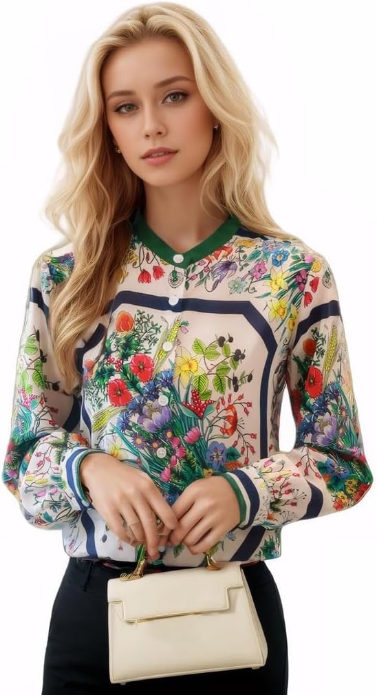 Women's Printed Flowers Commercial Long Sleeved Casual Loose Lapel Button Down Shirt Blouse Tops.