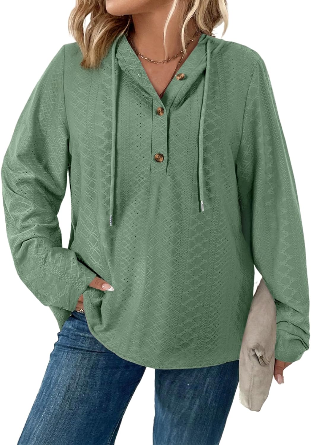 Eytino Womens Plus Size Sweatshirts Long Sleeve V Neck Embroidered Eyelet Drawstring Button Pullover Hooded Tops(1X-5X)