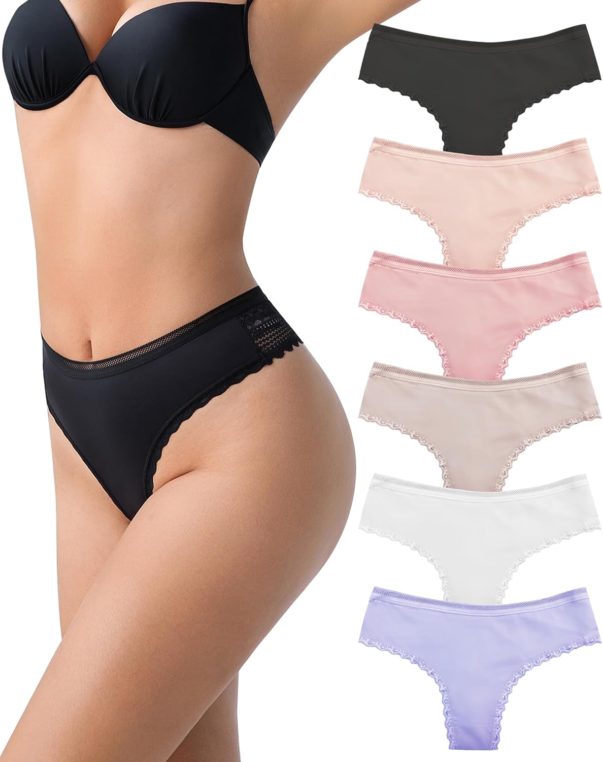 Lace Thongs for Women Sexy Ladies Silk Tanga Panties Breathable Hipster Seamless Underwear 6 Pack