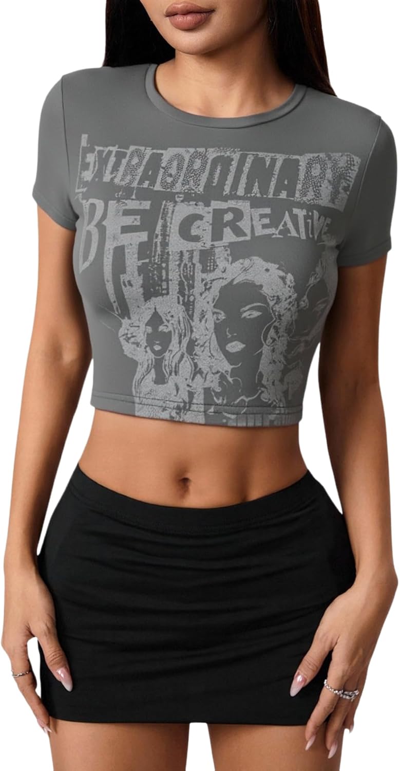 Women's Vintage Graphic Crop Tops Summer Y2k Crew Neck Short Sleeve Fitted Rave T Shirts