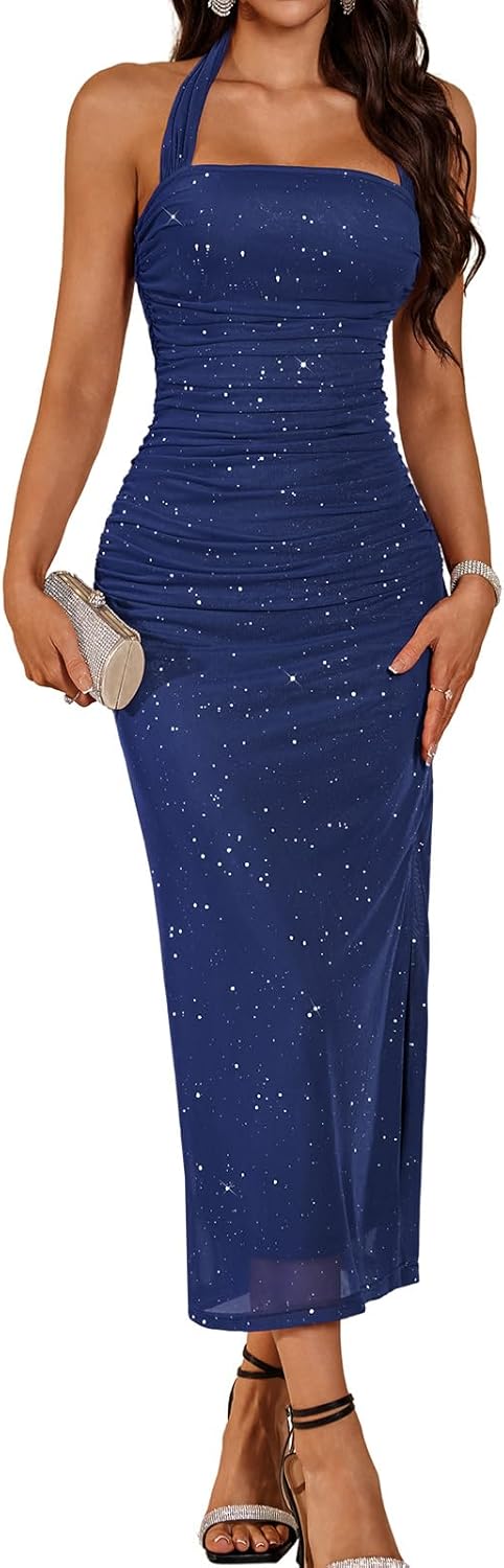 DRESSTELLS Women's Sparkly Formal Dress 2026, Halter Ruched Wedding Guest Dress, Sequin & Stretchy Mesh