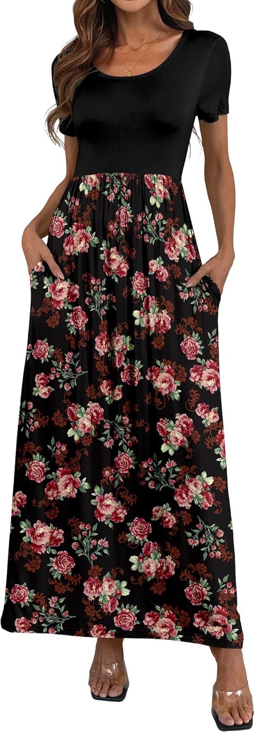 Women's Short Sleeve Loose Plain Long Maxi Casual Dresses with Pockets 2XL Rose Black