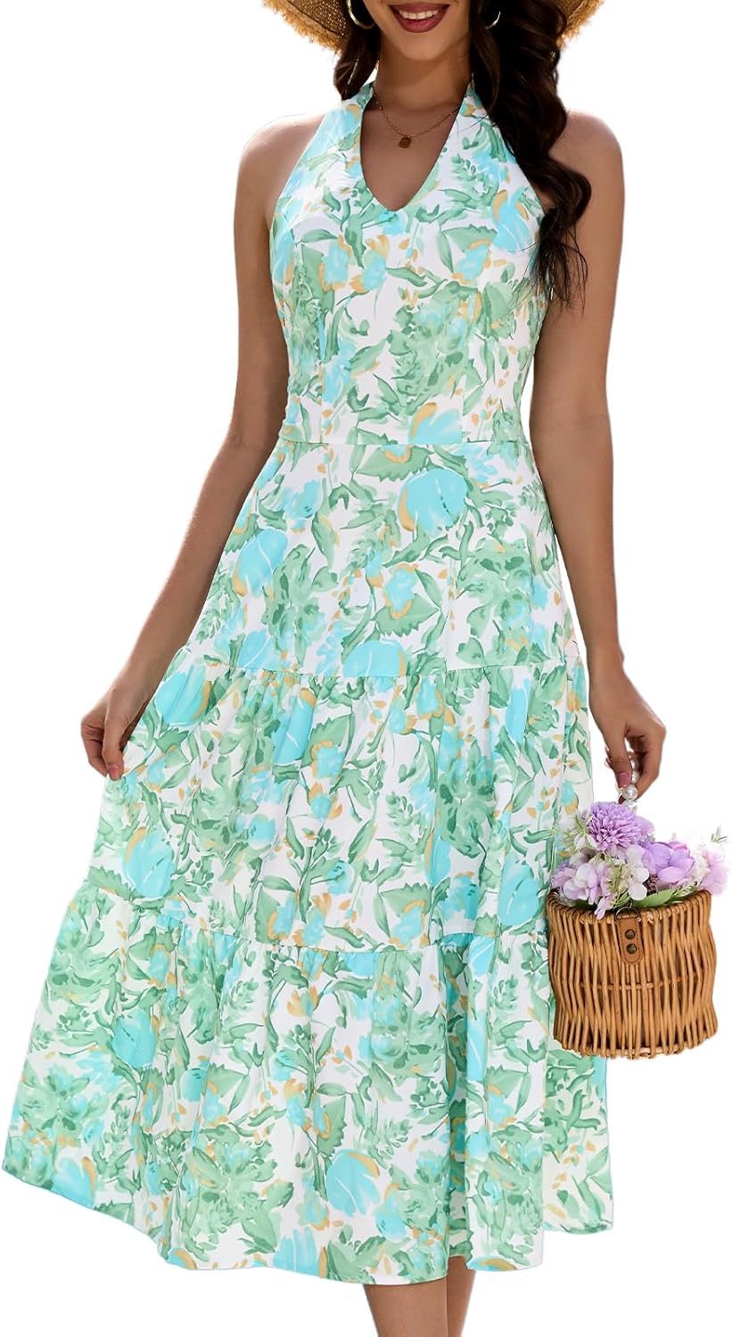 DRESSTELLS Womens Summer Floral Maxi Dress 2026 Casual Halter Spaghetti Strap Tiered Flowy Beach Long Sundress