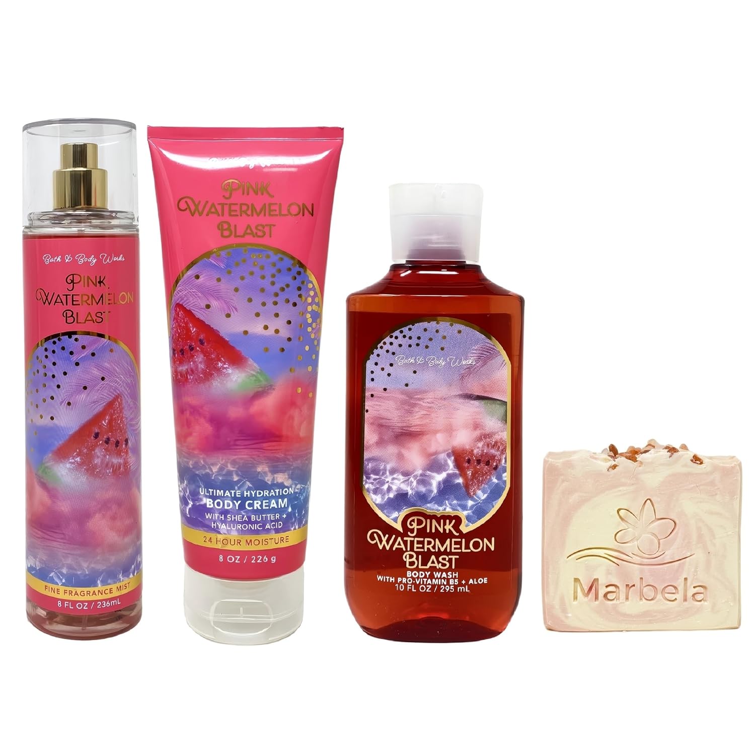 - Bath & Body Works Pink Watermelon Blast 3 Piece Set with a 4 oz Marbela Himalayan Salts Springs Bar Soap (Soap May Vary).
