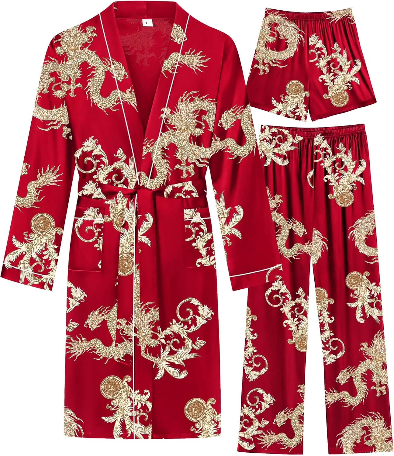 SWOMOG Mens 3 PCS Satin Robe with Pants & Shorts Set Kimono Bathrobe Long Sleeve Sleepwear Pjs Sets with Pockets
