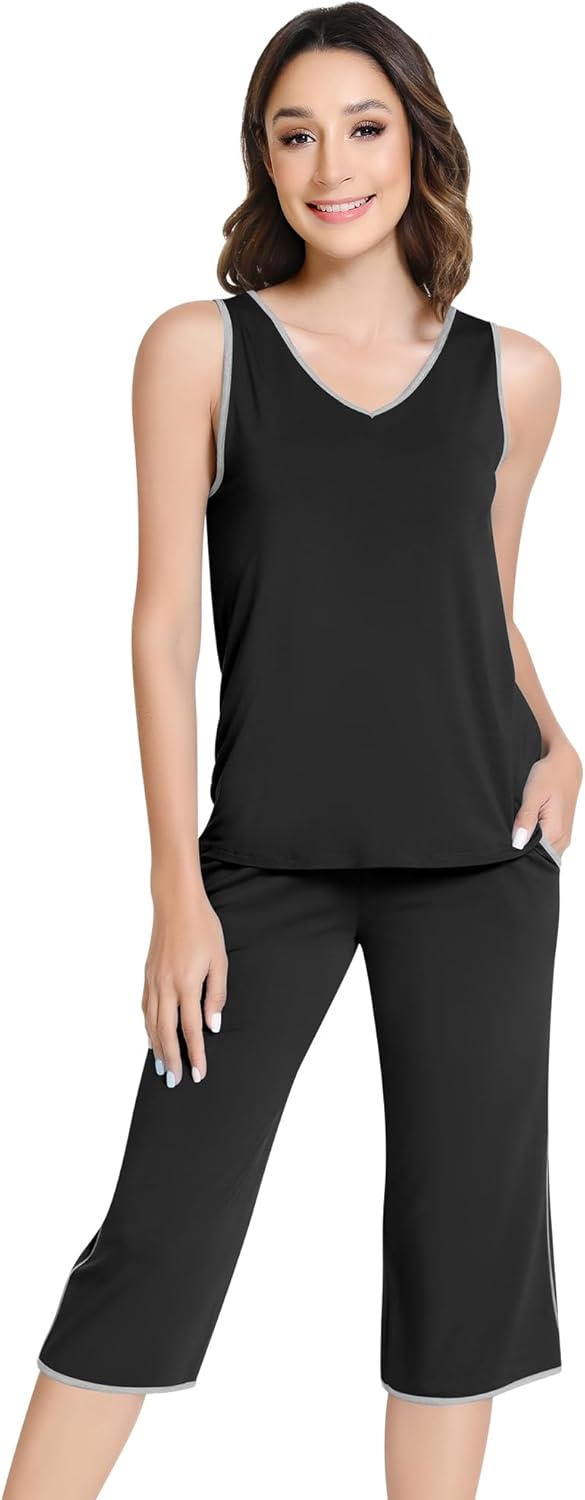 NACHILA Women's Pajamas-Viscose Made from Bamboo, Sleeveless Pajama Set Soft Tank Top Sleepwear Capri Pants Pjs