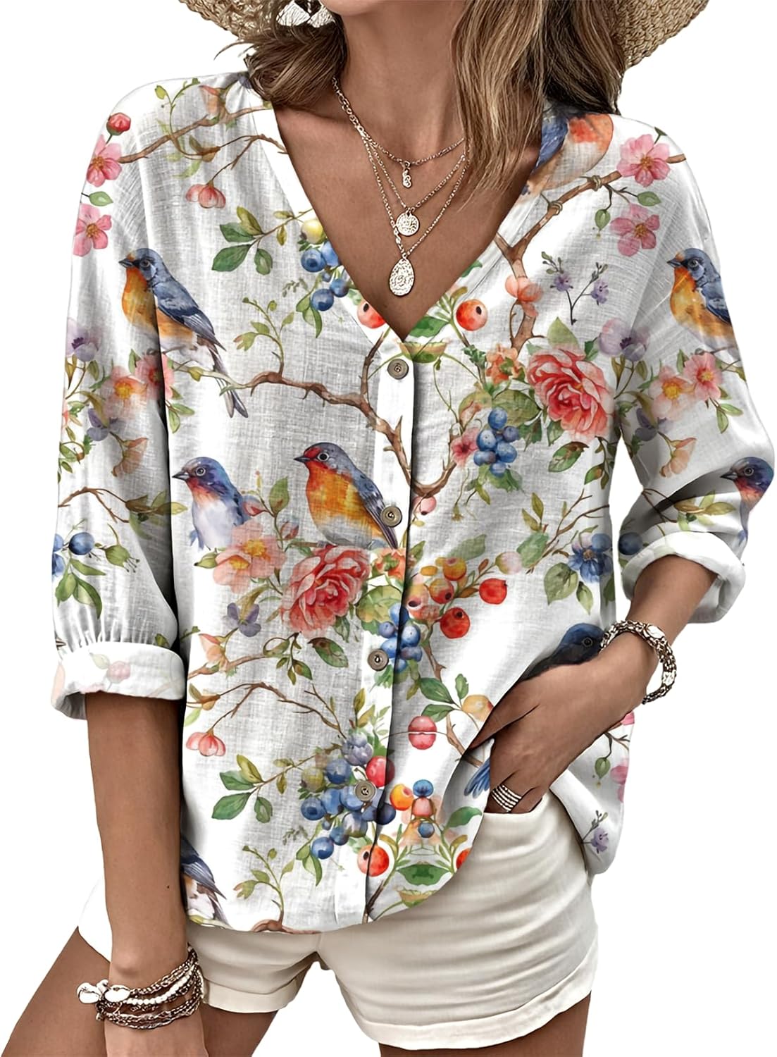 Boho V Neck Oversized Button Up Shirt Western Breathable Blouses for Women Trendy Hawaiian Beach Vacation Wear