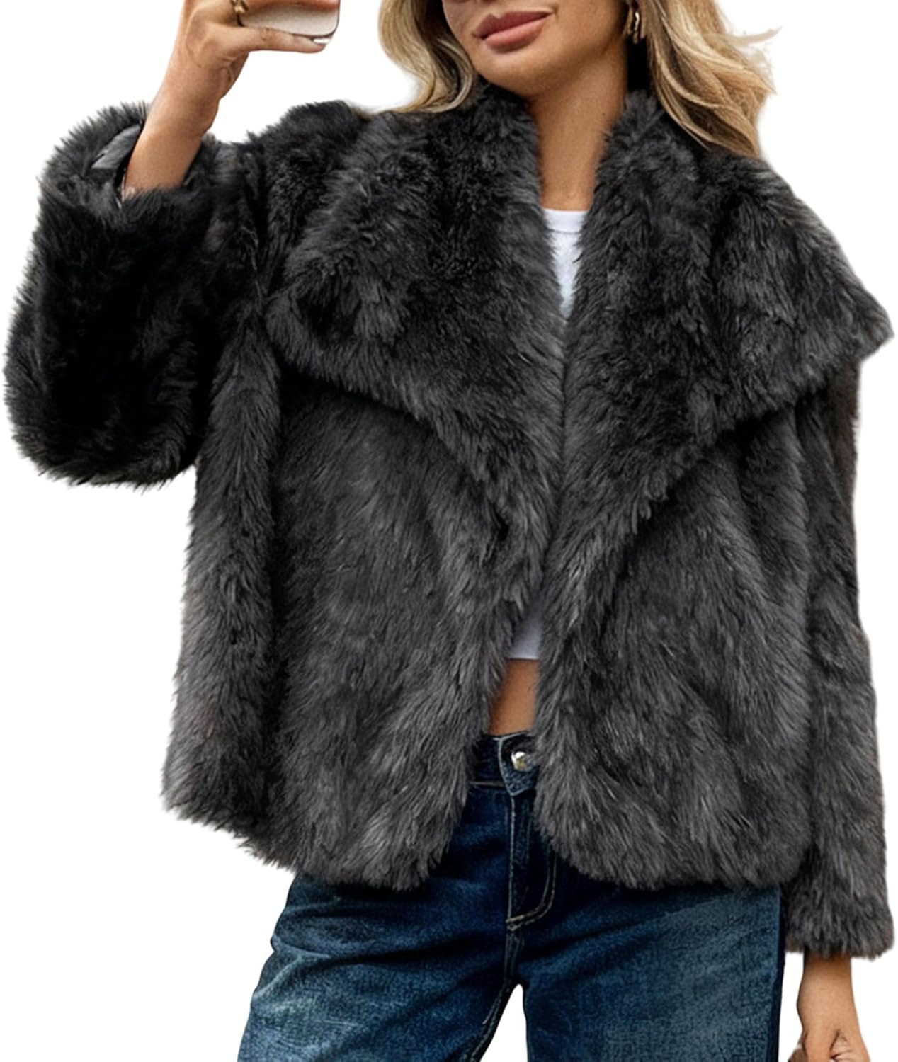 ALSOGO Women's Faux Fur Coat Fluffy Shaggy Jacket Lapel Open Front Long Sleeve Jackets Winter Warm Furry Overcoat Deep Grey L