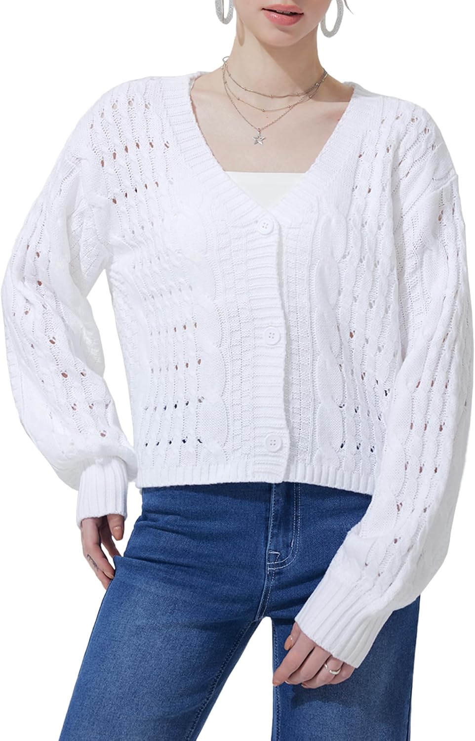 FASHIONSPARK Womens Cropped Cardigan Sweater V Neck Button Long Sleeve Lightweight Cable Knit Loose Fit Spring