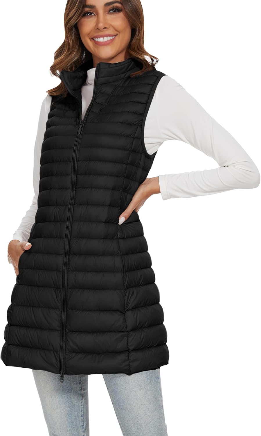 Long Puffer Vest for Women Winter Lightweight Down Vest Black Womens Vests Outerwear Sleeveless Jacket with Pockets