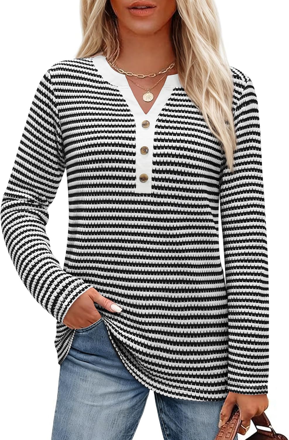 Striped Long Sleeve Shirt Women Waffle Knit Tops V Neck Shirts Womens Blouses Basics Clothing Cruise Outfit