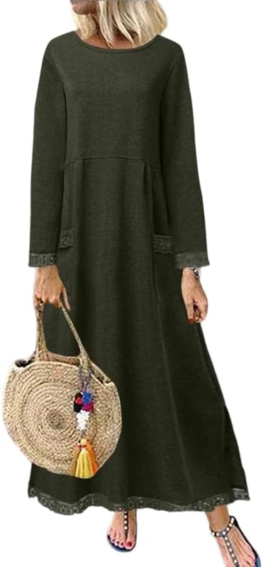 Women's Long Sleeve Fleece Lined Knit Tunic Maxi Dress with Pockets, Loose Fit Casual Winter Fall Plus Size Lace Trim Dresses