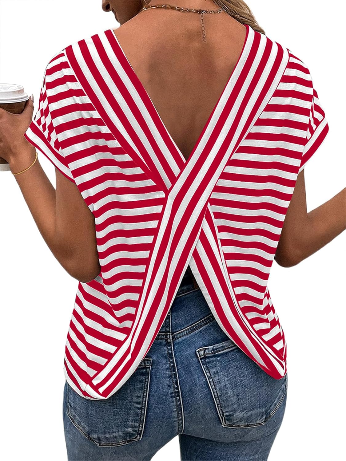 LilyCoco Womens Striped Open Back Tops Criss Cross Back Batwing Sleeve T Shirt