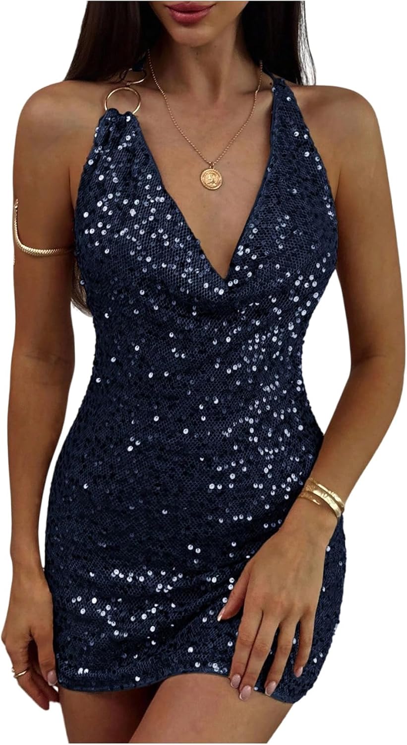 OYOANGLE Women's Sequin Sparkly Cami Halter Mini Dress Cowl Neck Ruched Backless Party Cocktail Dresses