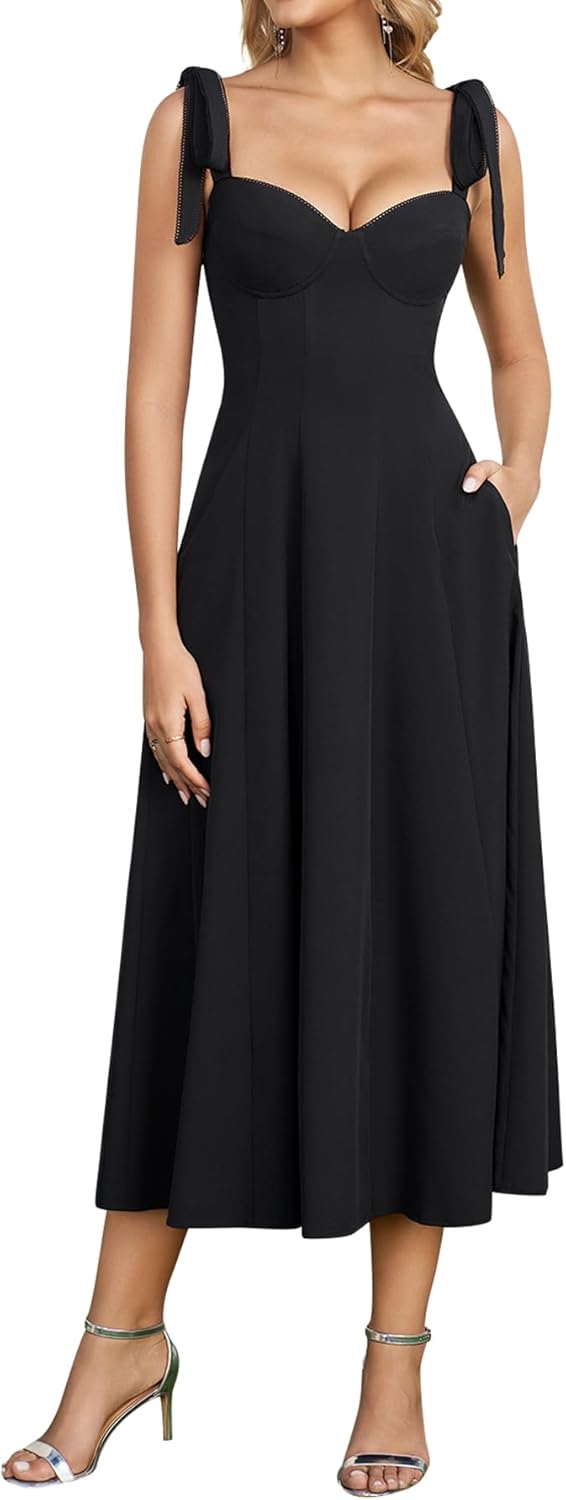 KUTUMAI Floral Corset Midi Dress Tie Shoulder Flowy Summer Wedding Guest Dresses for Women Sundress with Pockets