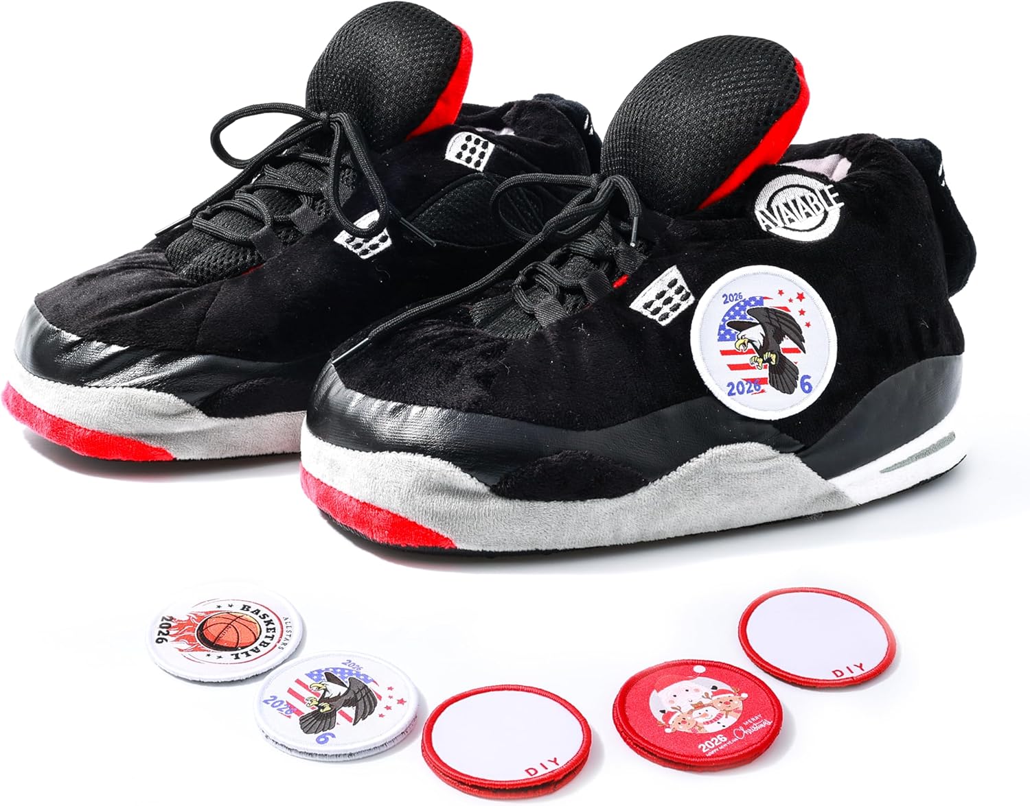 Sneaker Slippers, Funny Home Pantuflas for Women & Men Comfy Furry Warm Fluffy, Non Slip Sole, Unisex One Size Fits Most, With 5 Pairs Replaceable Decor Embroidered Patches