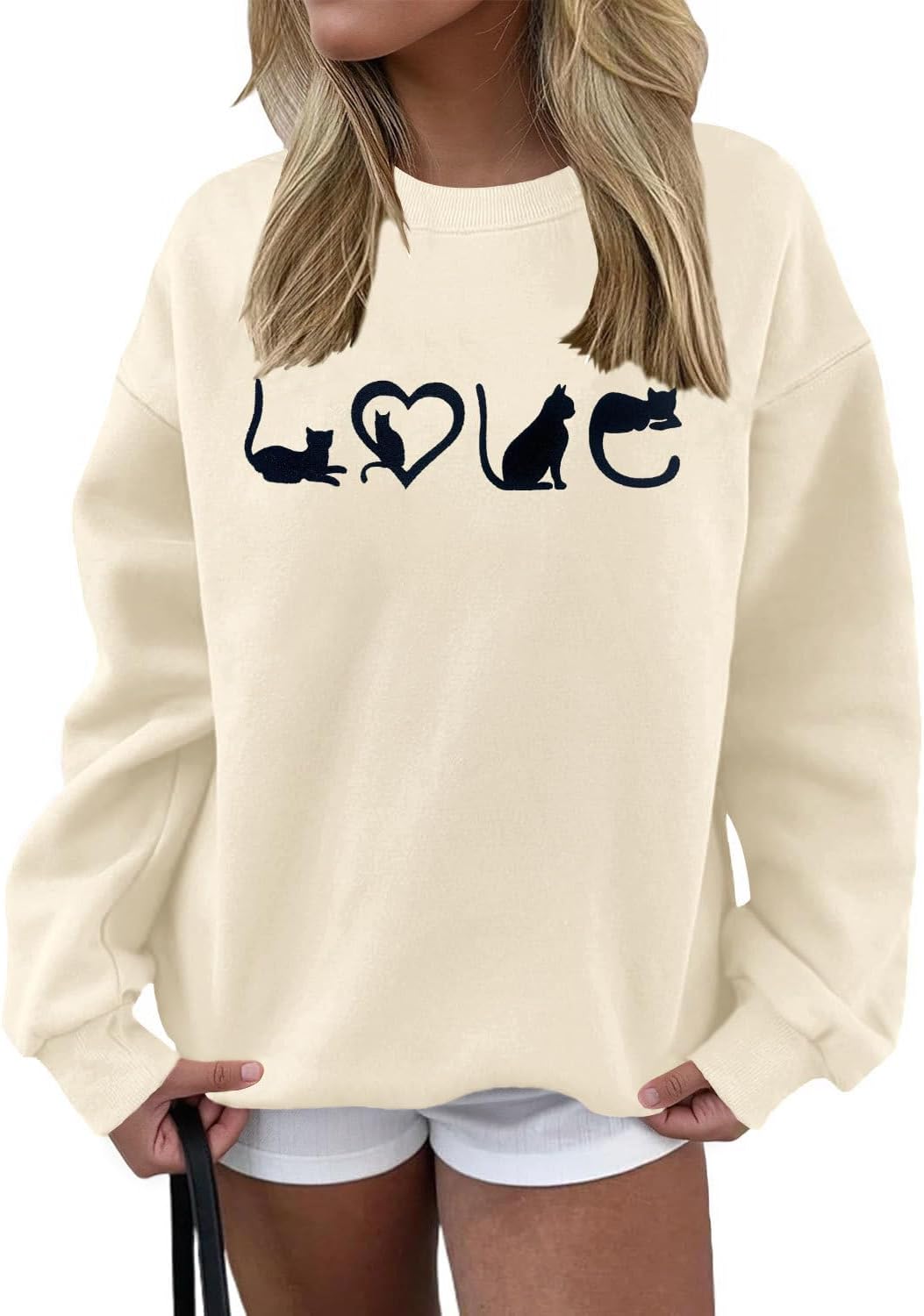 Cat Valentine Sweatshirts for Women Fleece Cute Cat Love Sweatshirt Valentine's Gift Long Sleeve Shirt
