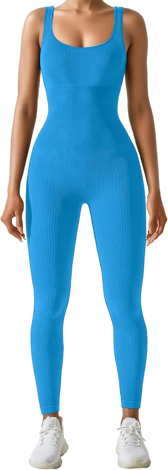 AURUZA Jumpsuit for Women Workout Seamless Jumpsuits Yoga Ribbed One Piece Tank Tops Rompers Sleeveless Exercise Jumpsuits, XL, Blue-new