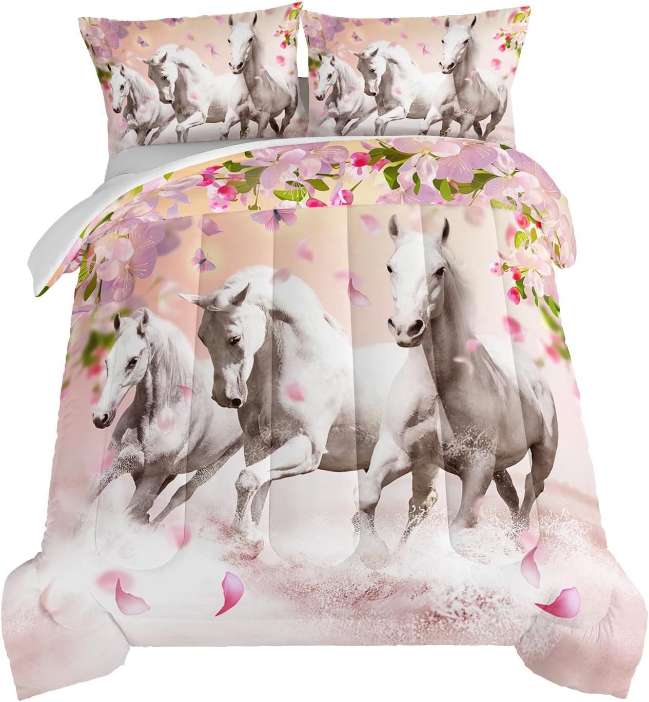 - 【Features】We use beautiful 3D horse and Cherry blossoms print bedding pattern to create animal themed bedroom for our homes. The farmhouse comforters & sets is an excellent gifts for girls,women,kids, teens.