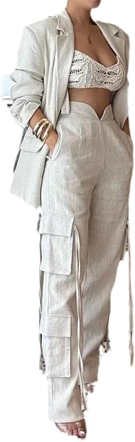 Famnbro Womens Suits 2 Piece Set Long Blazers Jacket Lapel and Straight Leg Pants Business Outfits