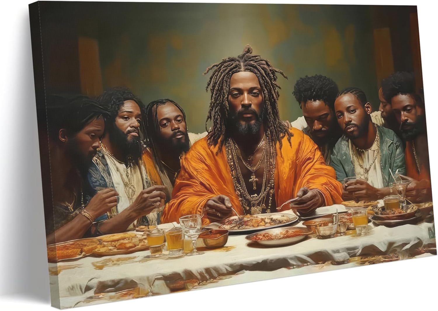FYLDPSB Afrocentric Renaissance Wall Art, 16W x 24H Canvas Print – Modern Last Supper Reimagined Wall Decor with Pre-Installed Hanger for Prayer Room, Office or Gift