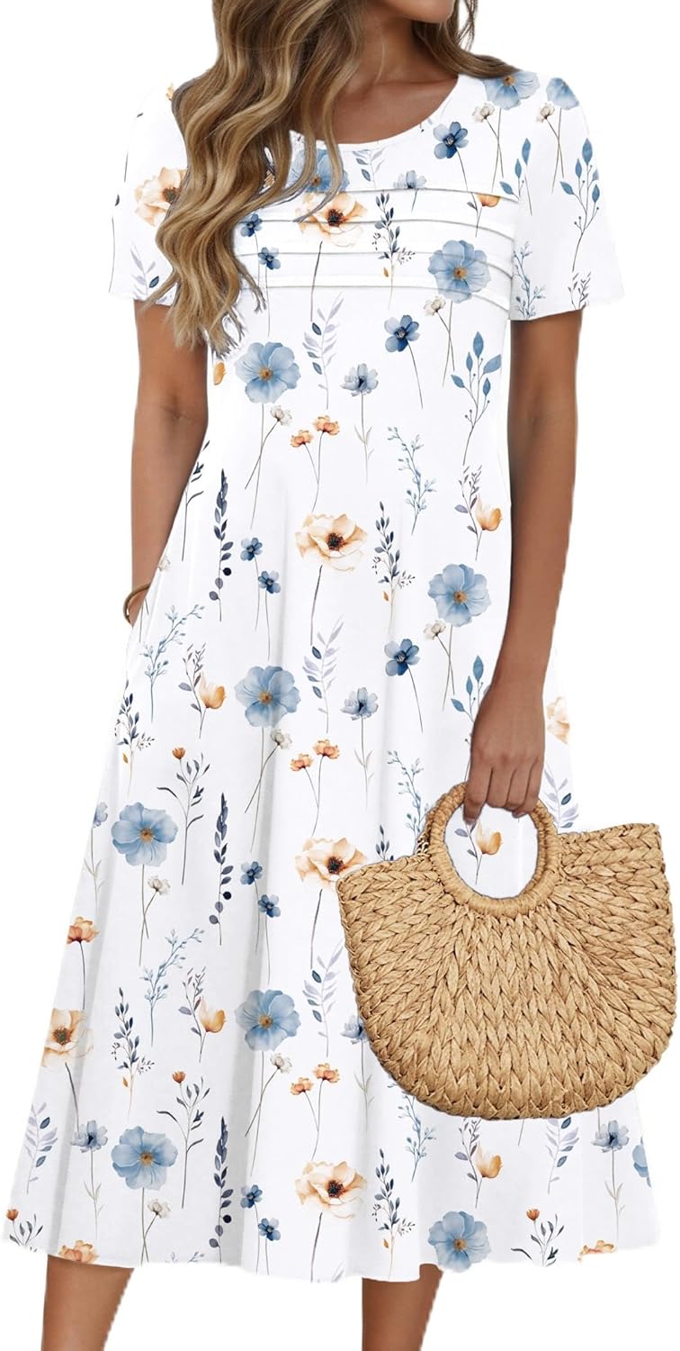 Zeagoo Womens Casual Dresses for Summer Short Sleeve Flare Midi Dress Loose Beach Sundress Pleated Front Dress with Pockets