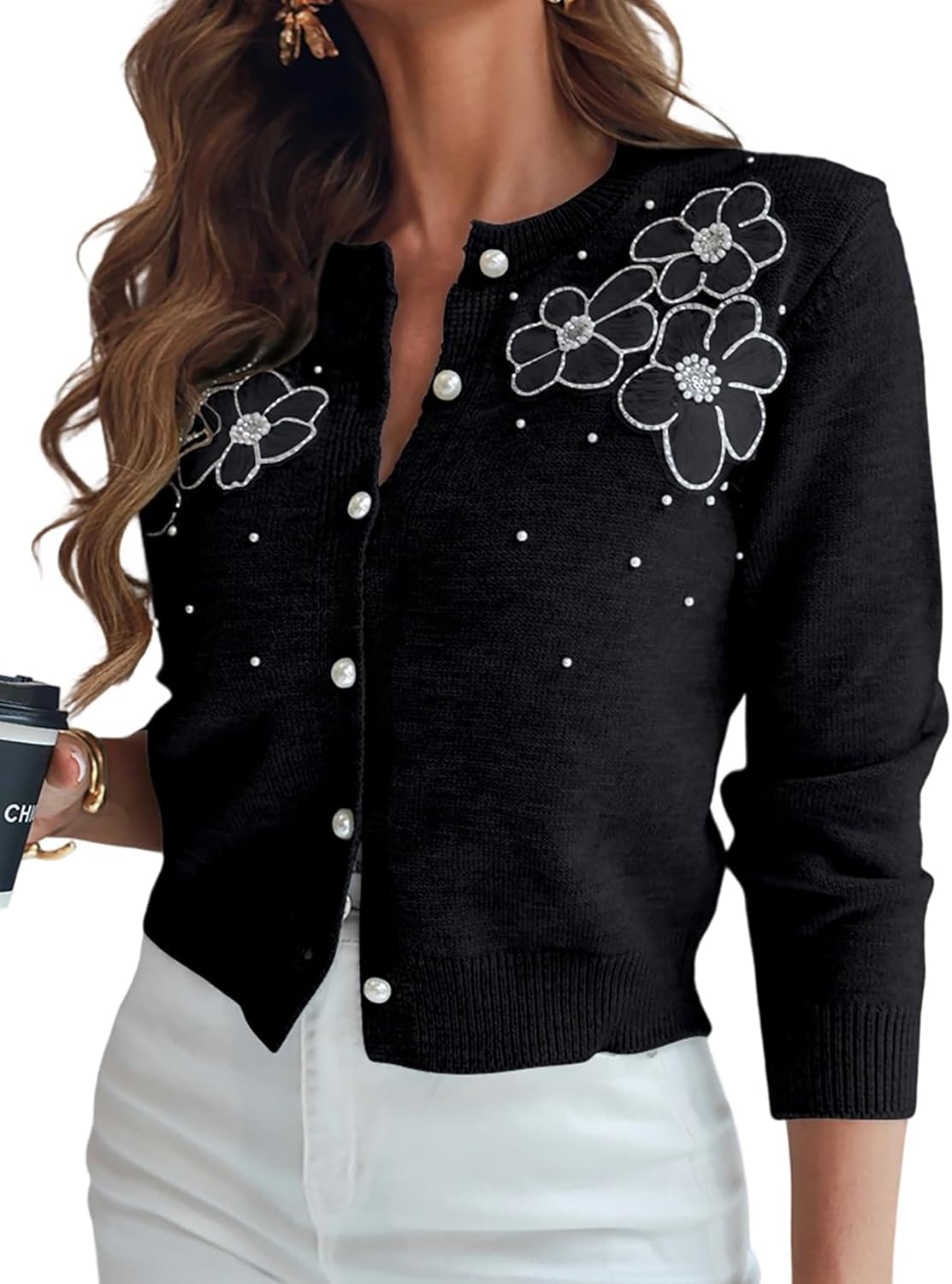 CHICME Womens Elegant 3D Pearl Embellished Floral Knit Cardigan Long Sleeve Round Neck Front Sweater Coat