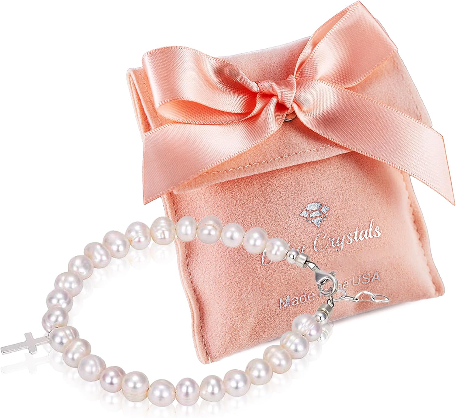 Baby Crystals Beaded Bracelets for Girls, Sterling Silver Cross Charm Bracelet White Cultured Freshwater Pearl, Baby Girl Keepsake, Christening, Baptism Gifts for Girl