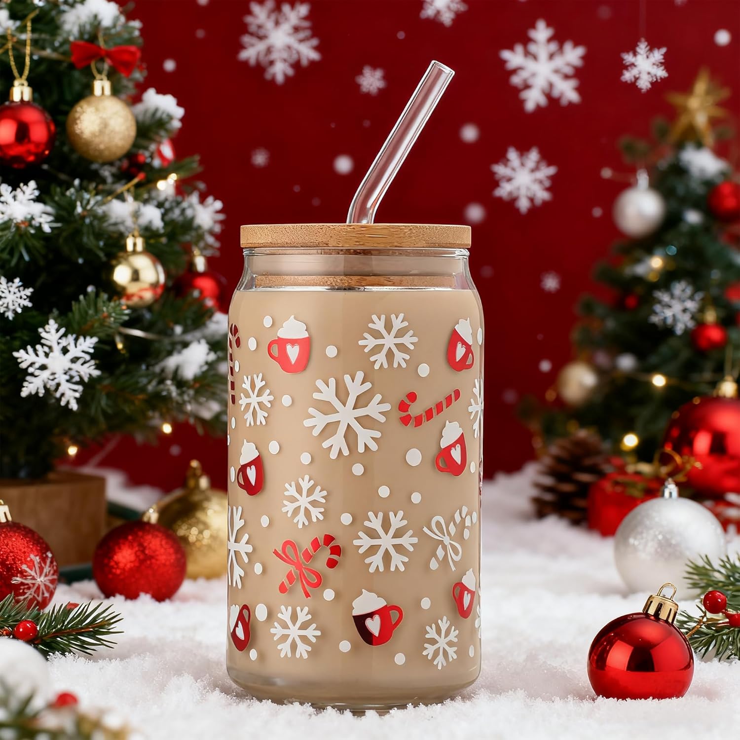 - [Festive Snowflake Christmas Glass Cup - Whimsical Winter Design] Our 16oz glass cup showcases a festive winter scene with delicate snowflakes, red-and-white striped candy canes, and a creamy red mug. Perfect for holiday beverages like hot chocolate or eggnog. This reusable cup brings seasonal charm to every sip, making it an ideal Christmas gift and delightful celebration addition