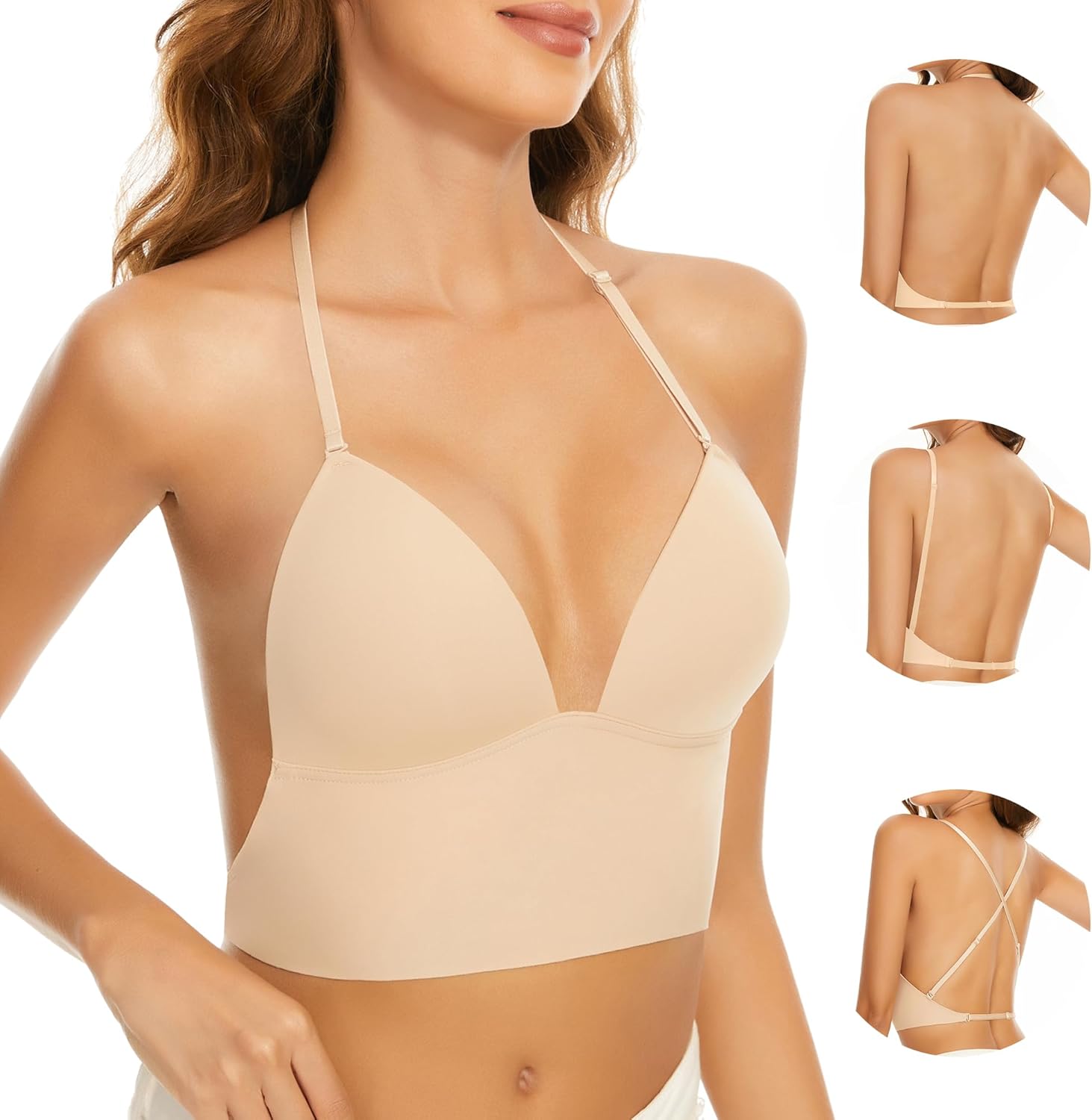 Low Back Bras for Women-Seamless Invisiable Backless Bras-Wireless Triangle Bralette Low Cut Open Back Multiway Halter Bra