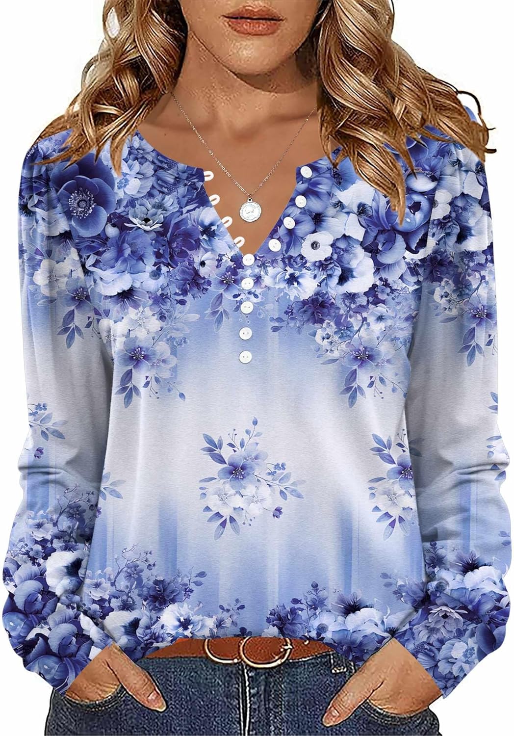 Zeagoo Fall Tops for Women Long Sleeve Button Up Shirts Floral Tunics V Neck Pullover Blouse