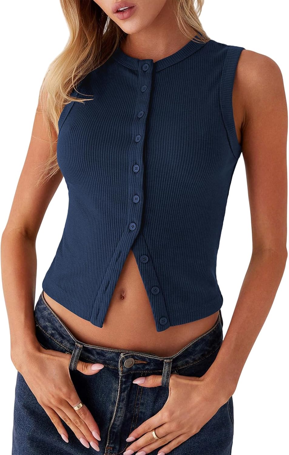 Women Ribbed Knit Button Down Tank Tops Y2K Sleeveless Open Front Crop Vest Slim Fit Going Out Tops Streetwear