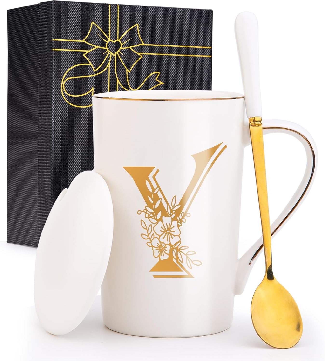 - BEST INITIAL MUG GIFTS FOR WOMEN: Our Letter Y with Flower mug gifts for women men comes in a beautiful black gift box, which will be fantastic gift for the Libra in your life. It also contains a nice cup lid and a golden spoon. It is ideal for a present or a treat for yourself.