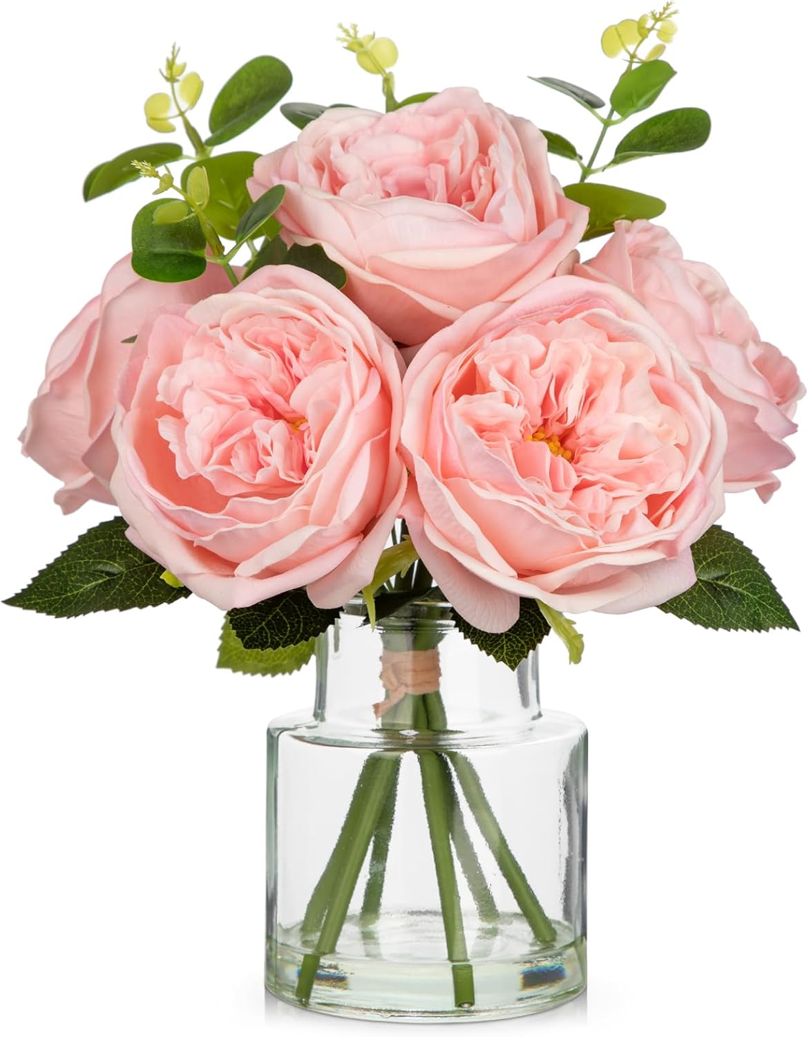 Hollyone Real Touch Peonies Artificial Flowers Arrangements in Vase Pink Fake Peonies with Glass Vase Silk David Austin Roses Faux Flowers with Faux Water Bouquet Table Floral Centerpiece Home Decor