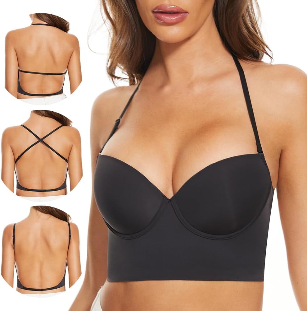 Low Back Bras for Women-Seamless Lightly Lined Invisible Backless Bra-Underwire Plunge Open Back Multiway Halter Bra