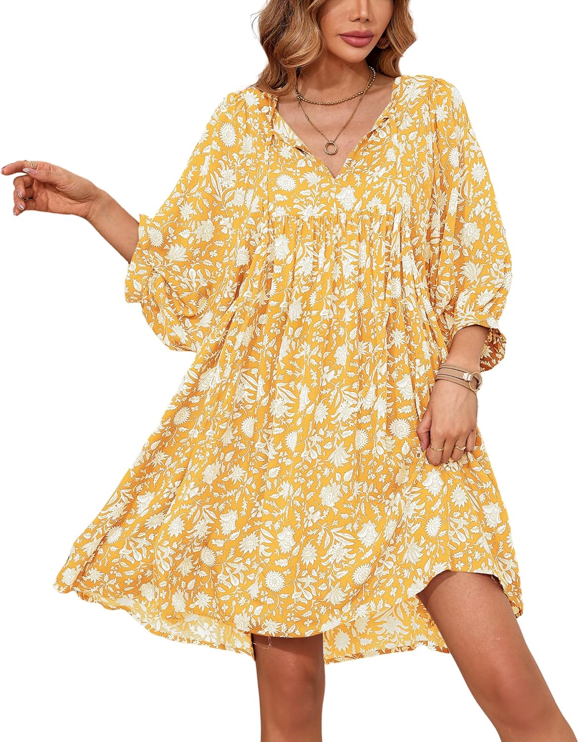 R.Vivimos Women's Summer V Neck Casual Dresses Lantern Sleeve Boho Floral Print Loose Flowy Mini Dress
