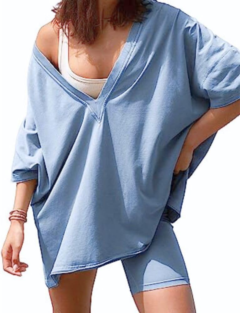 VAOYIU Womens 2 Piece Outfits Oversized Hot Shot Reversible Set V Neck T Shirt Biker Shorts Workout Sets