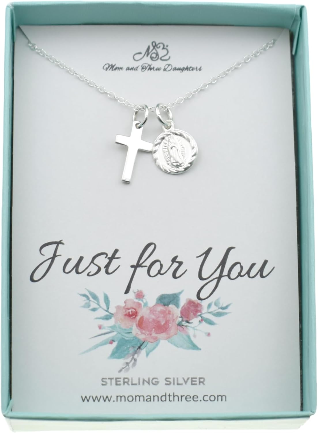 MOM & THREE DAUGHTERS Tiny Cross and Virgin Mary Necklace | 14" Sterling Silver Cable Chain | Little Girl's Jewelry |