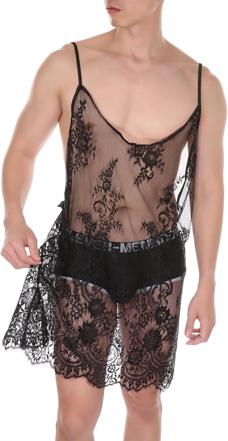 ABAFIP Men's Sissy Lace Lingerie Floral Mesh See Through Nightwear Sheer Mini Dress Crossdress Sleepwear