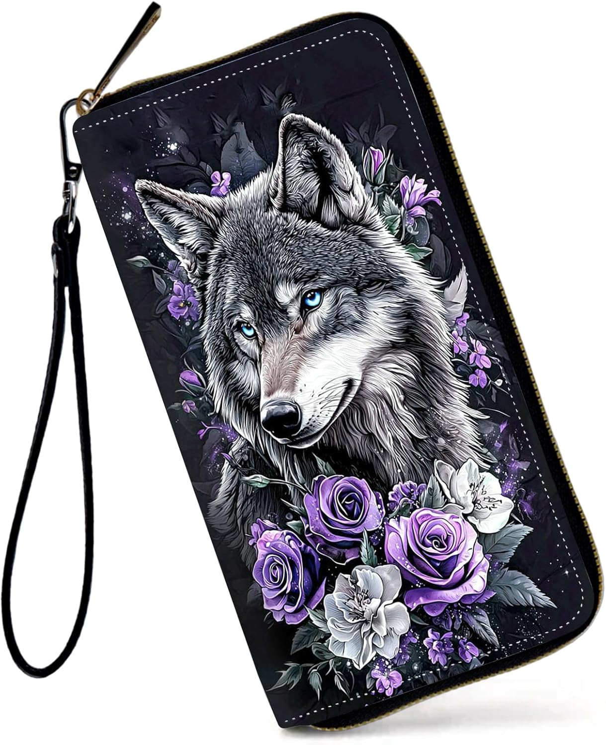 Wristlet Wallets for Women,Large Capacity RFID Blocking Leather Zip Around Travel Wallet Phone Purse Clutch Bag w/8 Cards Holder & Zip Inner Pocket-Wolf with Purple Flowers