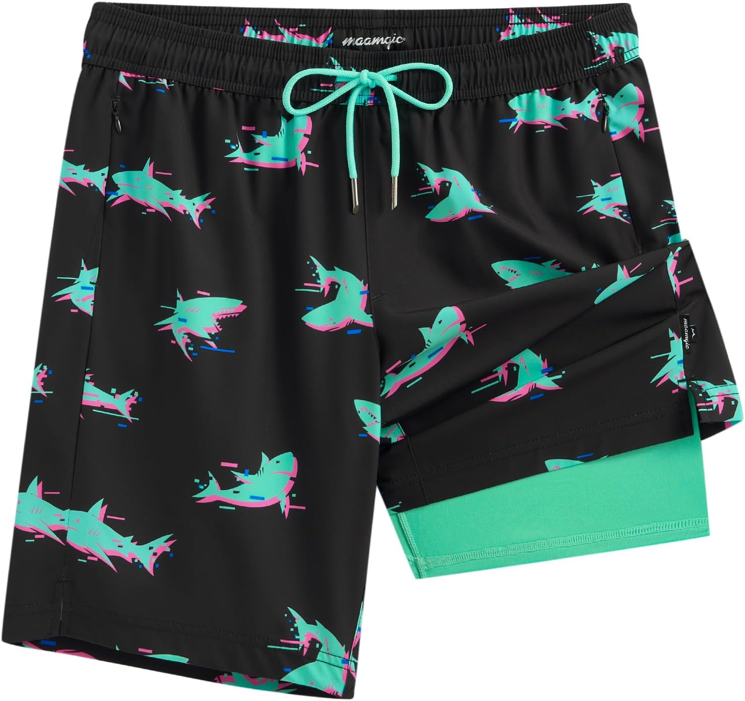maamgic Mens Swim Trunks with Compression Liner 9 Inch Recycled Stretch Bathing Suit with Zipper Pockets Quick Dry Swim Short