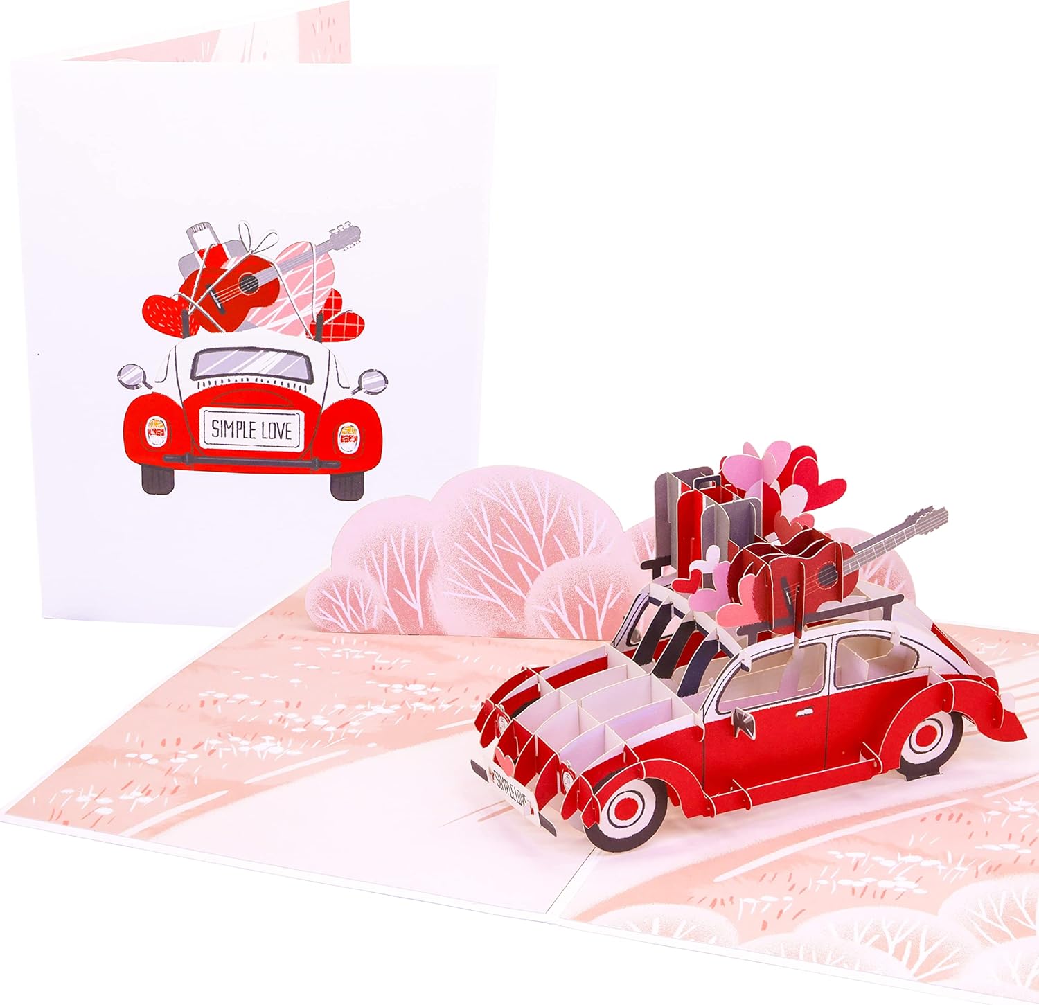 - 🚗 A ROMANTIC SURPRISE THEY’LL NEVER FORGET Open the card to reveal a beautifully detailed 3D pink love bug car filled with hearts, luggage, and guitar – a joyful pop-up that instantly says “Simply Love.”