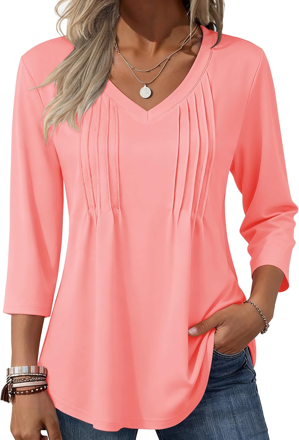 Zeagoo 3/4 Length Sleeve Womens Tops Casual V Neck Pleated Top Boho Floral Blouses Work Shirts