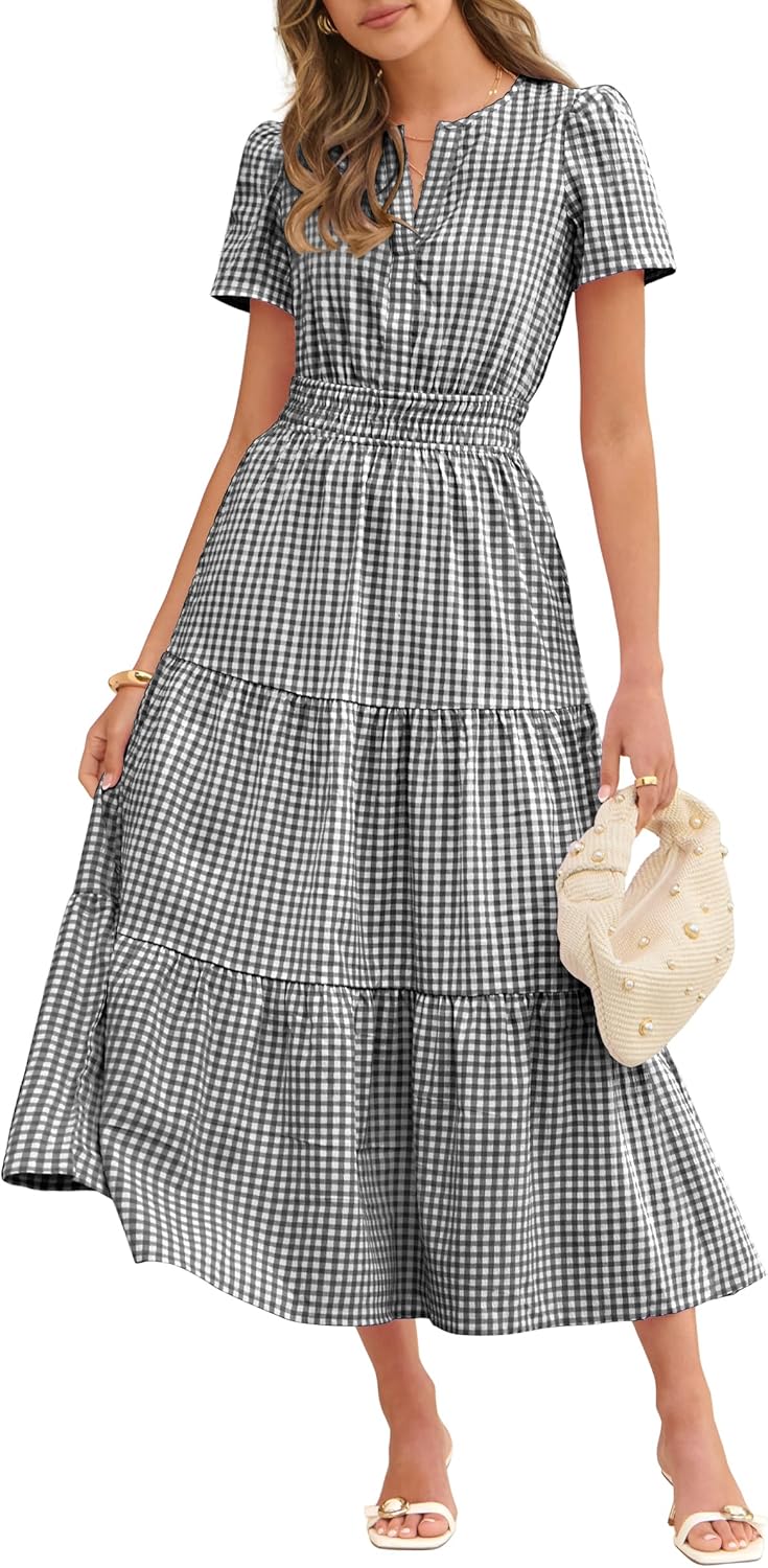Caracilia Womens Summer Maxi Dresses 2026 Spring Casual V Neck Short Sleeve Gingham Flowy A-Line Beach Vacation Party Dress