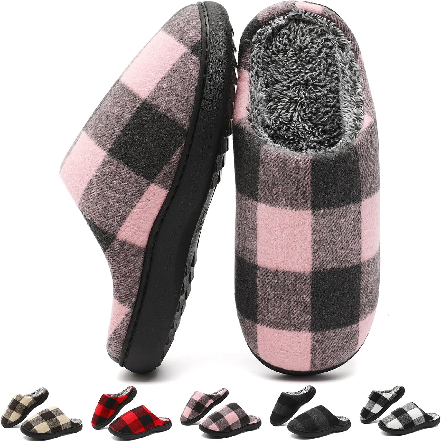 House Slippers for Woman Men, womens Checkered Slippers on House Shoes Cozy Memory Foam Scuff plaid Shoes with Fuzzy Faux Fur Comfortable Non-Slip Warm Fuzzy indoor outdoor